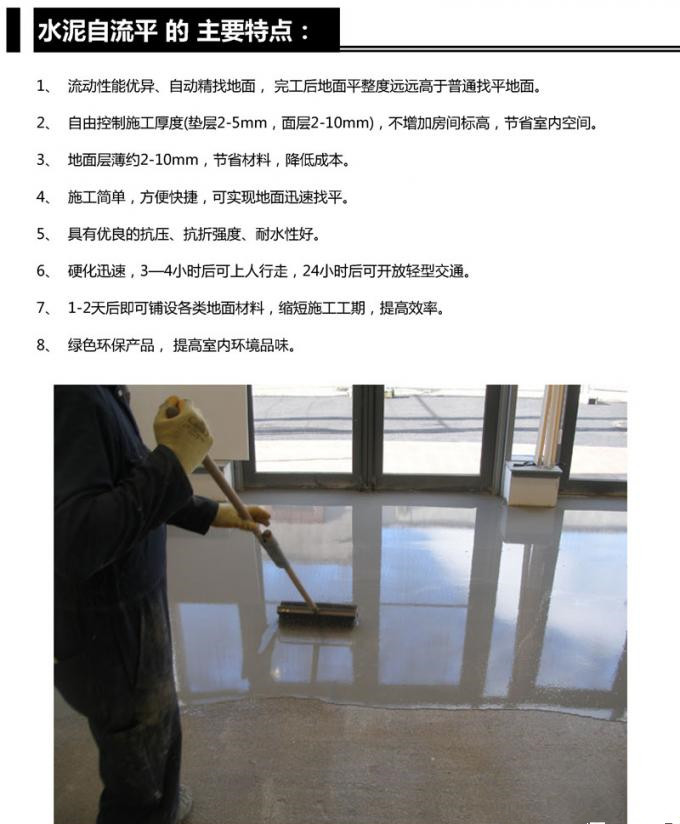 水泥自流平是一種科技含量高、技術(shù)環(huán)節(jié)復(fù)雜的高新綠色產(chǎn)品.是由多種活性成分組成的干混型粉狀材料,自流平是一種地面施工技術(shù),它是由多種材料同水混合而成的液態(tài)物質(zhì),倒入地面后,這種物質(zhì)可根據(jù)地面的高低不樣順勢流動,對地面進(jìn)行自動找平,并能很快干燥,固化后的地面會形成光滑、平整、無縫的新基層。